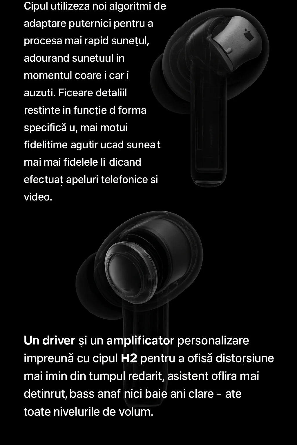 AirPods Pro 2 au fost reproiectate pentru experiente audio si mai bogate. Anulare activa a zgomotului next-level si Adaptive Transparency reduc mai mult zgomotul extern. Spatial Audio duce imersiunea la un nivel remarcabil de personal. Controlul tactil va permite acum sa reglati volumul cu o glisare. Iar 6 ore de autonomie a bateriei la o singura incarcare va asigura energie suficienta pentru orice.